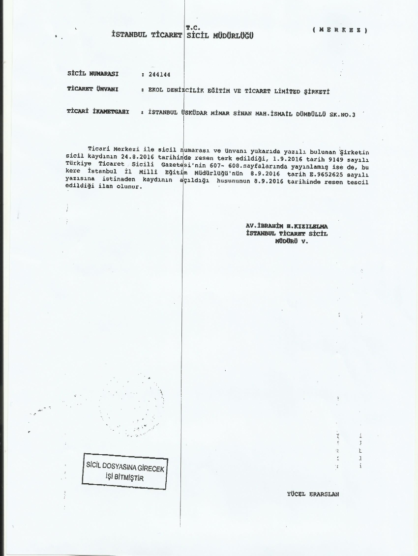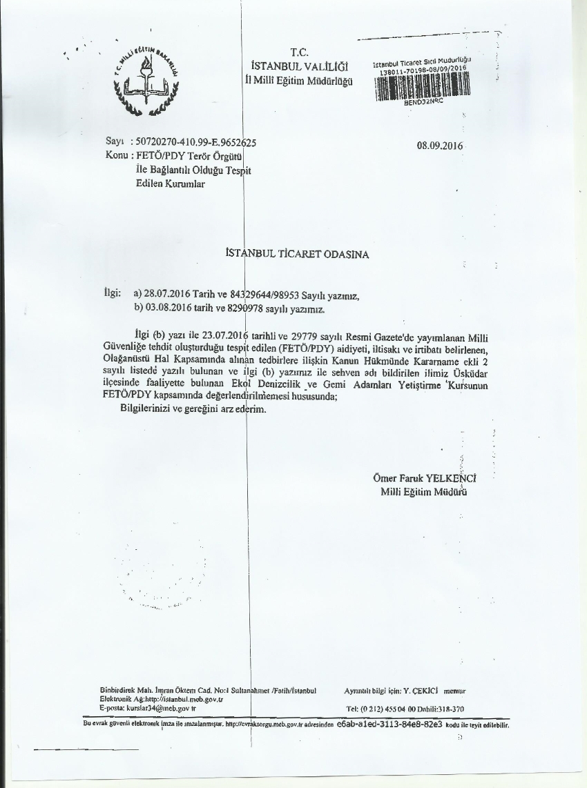 İl Milli Eğitim Müdürlüğünce İstanbul Ticaret Odası'na bir yazı yazılarak, "Ekol Denizcilik ve Gemiadamları Yetiştirme Kursu" nun adının, 29779 Sayılı Resmi Gazete'e yayınlanan FETÖ/PDY aidiyeti, iltisak ve irtibatı belirlenen kuruluşlar arasında sehven yazılmış olduğunu ve bu kapsamda değerlendirilmemesini istedi.