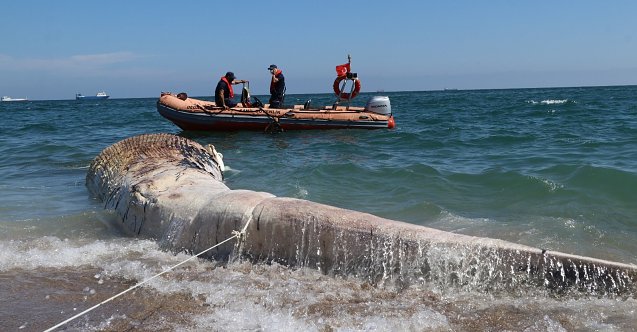 Mersin'de ölü olarak karaya vuran dev balina, 4 saatlik çalışmanın ardından sahile çıkarılabildi. Yapılan incelemede balinanın 1 tondan ağır ve yaklaşık 14 metre boyunda olduğu belirlendi. Balığın dünyanın en büyük ikinci balinası olan 'oluklu' türünden olduğu da kesinleşti.