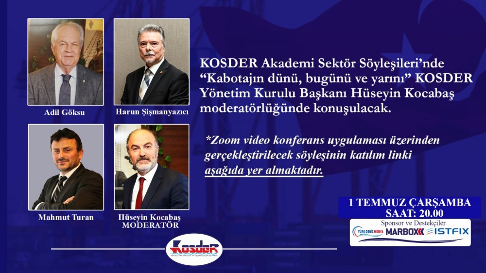 Saat 20:00'de KOSDER tarafından düzenlenen ''Kabotaj'ın Dünü Bugünü ve Yarını'' başlıklı zoom toplantısını izleyebileceğiz.