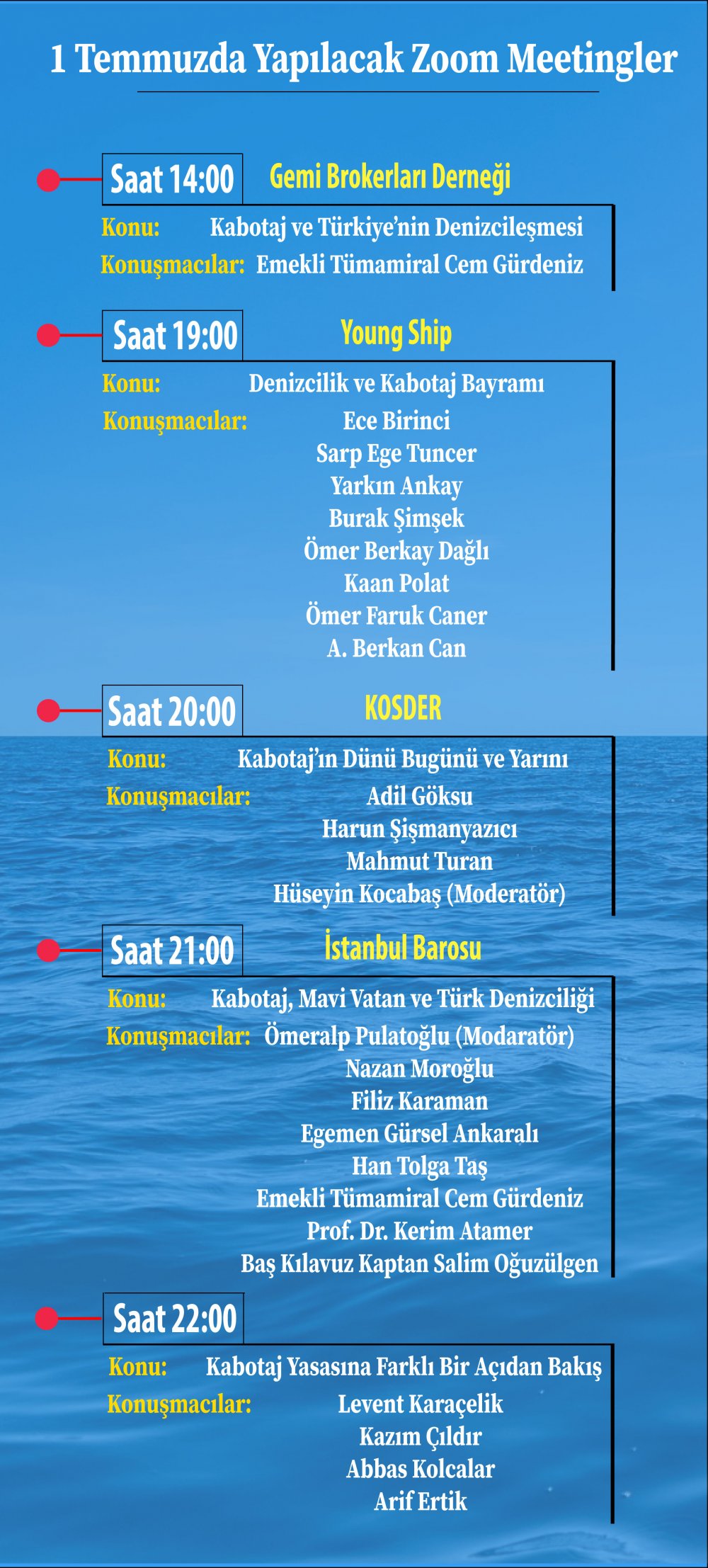 1 Temmuz Denizcilik ve Kabotaj Bayramı dolayısıyla yapılacak zoom toplantılarında yer alacak konuşmacılar ve toplantı konuları belli oldu. Toplantı düzenleyenler arasında Kosder, Gemi Brokerları Derneği, Young Ship, İstanbul Barosu gibi kurum ve kuruşlar yer alıyor.