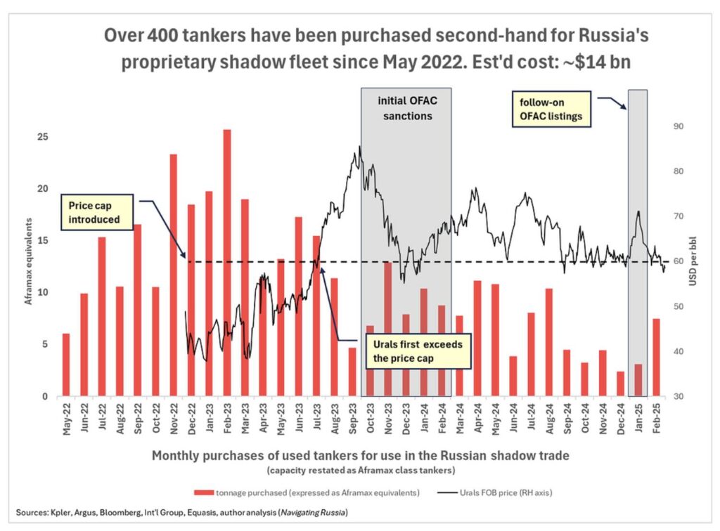 2025 yılında uygulamaya giren geniş çaplı tanker yaptırımları, Rusya’nın gölge filosunun kapasitesini %46 oranında azalttı. 2024'ün ikinci yarısında Rusya'nın Baltık limanlarından yükleme yapan ham petrol tankerlerinin %60'ından fazlası gölge filoya aitken, bu oran 2025 Mart ayı sonunda %40’ın altına düştü. Bu düşüşün yarattığı boşluk, ana akım tankerlerle doldurulmaya çalışıldı.