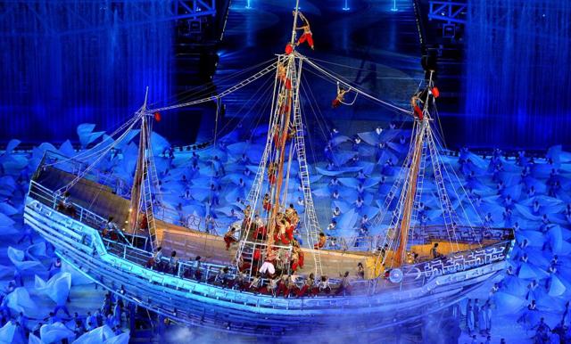 6 binden fazla performansçı, dansçılarla denize dönüştürülen sahne üzerinde Haixinsha adasında açılış gecesine özel olarak yapılan bir gemiyle muhteşem bir görsel ziyafet sundu.
