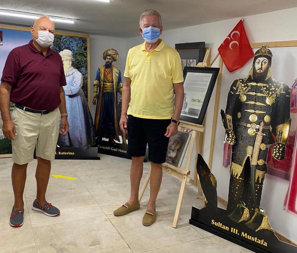 Koleksiyoner Oğuz Aydemir, ünlü televizyoncu ve gazeteci Uğur Dündar’a sergisi hakkında bilgi verirken arka planda II. Katerina, Cezayirli Gazi Hasan Paşa ve Sultan Mustafa’nın resim maketleri bulunuyor.