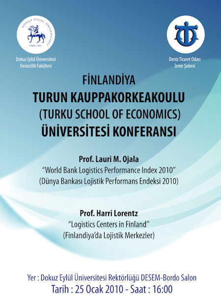 Dokuz Eylül Üniversitesi Denizcilik Fakültesi ve Deniz Ticaret Odası İzmir Şubesi'nin 25 Ocak 2010, Pazartesi günü saat 16.00'da DESEM ( Dokuz Eylül Üniversitesi Sürekli Eğitim Merkezi) Bordo Salon'da düzenleyeceği Konferans kapsamında; Prof. Lauri M. Ojala “World Bank Logistics Performance Index 2010”(Dünya Bankası Lojistik Performans Endeksi 2010) ve Prof. Harri Lorentz “Logistics Centers in Finland”(Finlandiya’da Lojistik Merkezler) konularında sunumlar yaparak izleyicilerin sorularını yanıtlayacak.