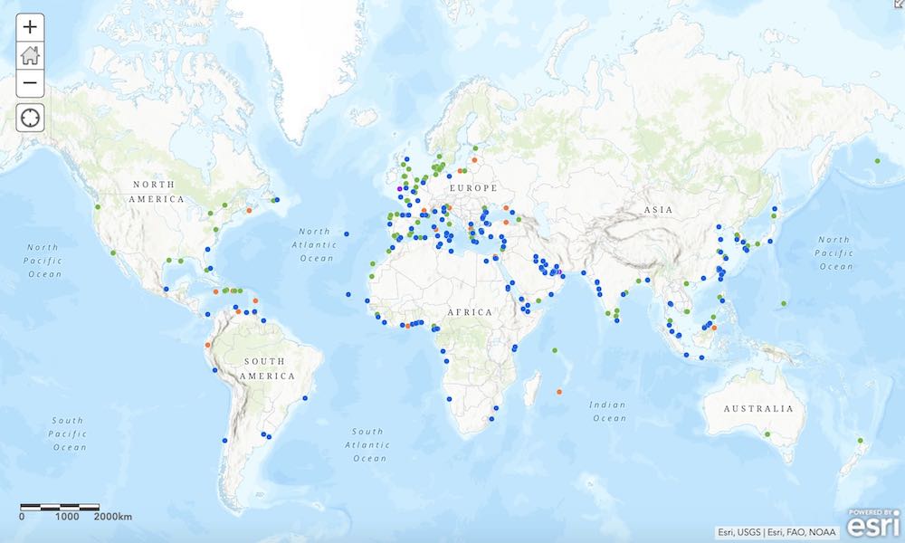 Aşağıdaki resim, Uluslararası Çalışma Örgütü veritabanındaki gemiler de dahil olmak üzere, dünya çapında mürettebat terk vakalarını gösteren en son Periplous haritasını göstermektedir. Mavi noktalar aktif vakaları, yeşil noktalar çözülmüş vakaları ve turuncu noktalar aktif olmayan vakaları gösterir.