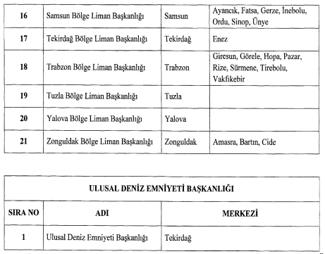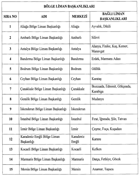 Cumhurbaşkanı Recep Tayyip Erdoğan’ın imzasıyla yayımlanan karara göre, ülke genelinde 21 adet bölge liman başkanlığı kurulurken diğer liman başkanlıkları da bu bölge başkanlıklarına bağlandı.