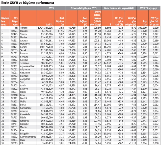 - İllerde kişi başına düşen GSYH cephesinde kayıpta olan illerin sayısı ekonomisi küçülen il sayısından fazla. Ekonomisi reel olarak küçülen il sayısı 16 iken, kişi başına geliri reel olarak düşen il sayısı 29.