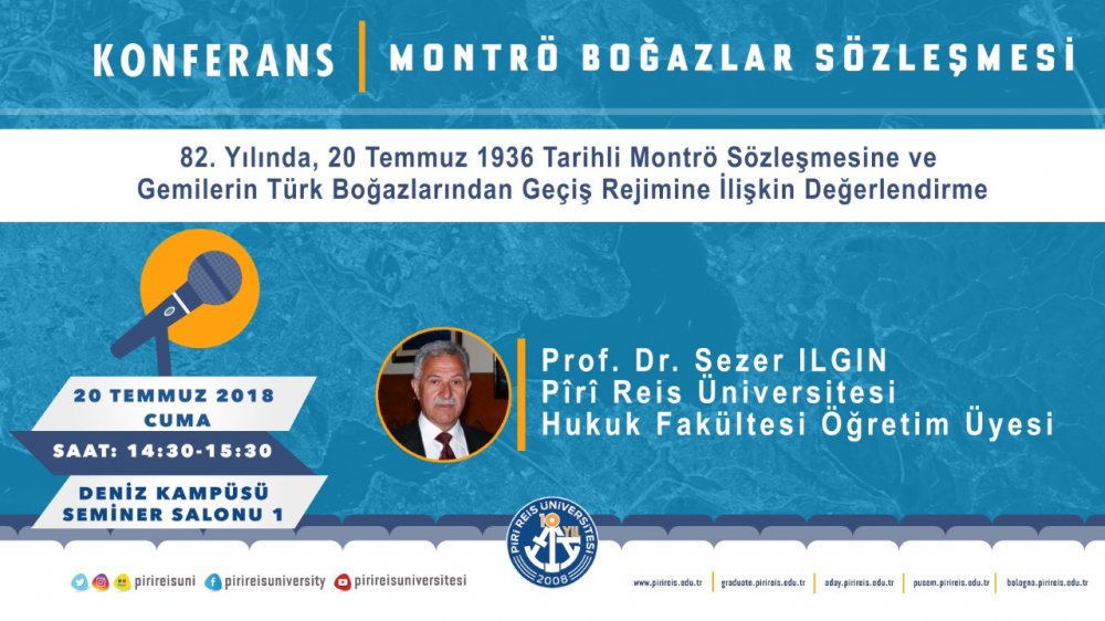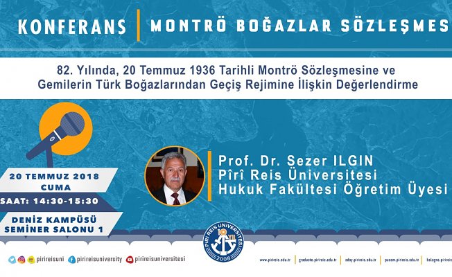 82. Yılında Montrö Boğazlar Sözleşmesi” Konferans 20 Temmuz 2018 Cuma Günü Saat 14.30 - 15.30 arasında Piri Reis Üniversitesi’nin Tuzla Deniz Kampüsü Seminer 1 Salonunda gerçekleştirilecektir.