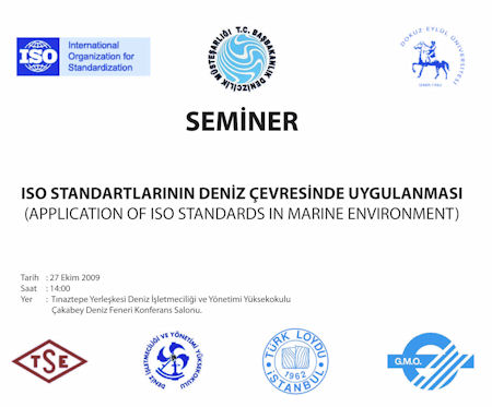 ISO Gemi ve Deniz Teknolojisi Teknik Komitesi’nin 26-30 Ekim 2009’da İzmir’de gerçekleştireceği yıllık toplantısı çerçevesinde Dokuz Eylül Üniversitesi Deniz İşletmeciliği ve Yönetimi Yüksekokulu'nda düzenlenen ISO STANDARTLARININ DENİZ ÇEVRESİNDE UYGULANMASI (APPLICATION OF ISO STANDARDS IN MARINE ENVIRONMENT) konulu seminer bugün 14:00'tebaşlıklı seminer bugün (27 Ekim 2009) saat 14.00’de gerçekleştirilecek.