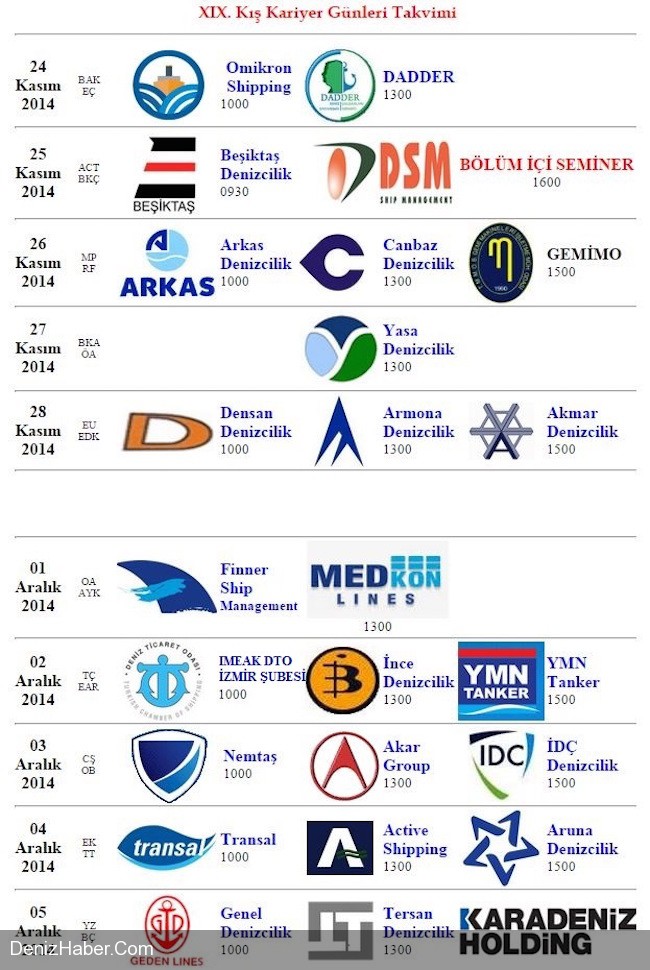 Dokuz Eylül Üniversitesi, Denizcilik Fakültesi’nde her yıl geleneksel olarak düzenlenen “Kış Kariyer Günleri” bu yıl da aynı heyecan ve coşkuyla 24 Kasım-05 Aralık 2014 tarihleri arasında düzenleniyor. Denizcilik camiasına ilk adımlar olarak bilinen Kariyer Günleri, genç zabit adayları için sektörden insanlarla tanışmak ve denizcilik mesleğine dair bilgi edinmek amacıyla neredeyse bir dönüm noktasıdır. Bu yıl 19’uncusu düzenlenen Dokuz Eylül Üniversitesi Denizcilik Fakültesi Kış Kariyer Günleri’ne 24 Kasım 2014 günü başlanacak ve programa 5 Aralık 2014’e kadar toplam 24 kurum ve kuruluş katılacaktır. TMMOB Gemi Makineleri İşletme Mühendisleri Odası, DADDER ve İMEAK DTO İzmir Şubesi’nin de katılımcı olduğu 19. Kış Kariyer Günleri’nin programı aşağıdaki gibidir: