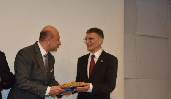 Toplantı sonunda Prof. Dr. Aziz Sancar’a Aydın İncirinin ithaf belgesi takdim eden AYTO Başkanı Hakan Ülken aynı zamanda Aydın İnciri de ikram etti.