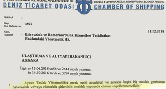 Oysa, IMEAK Deniz Ticaret Odası'nın taslak Yönetmelik ile ilgili Ankara'ya (Kendi ilgili Meslek Komitesinden bile habersiz olarak) gönderdiği "görüş yazısında" bile; "Taslak Yönetmelikte gerek gemi acenteleri ve gerekse başka bir meslek grubunun kılavuzluk ve/veya römorkör şirketinin ortaklık yapısında olması engellenmemelidir" dediği ortada idi.