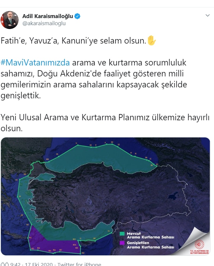 Ulaştırma ve Altyapı Bakanı Adil Karaismailoğlu, "Mavi Vatanımızda arama ve kurtarma sorumluluk sahamızı, Doğu Akdeniz’de faaliyet gösteren milli gemilerimizin arama sahalarını kapsayacak şekilde genişlettik. Yeni Ulusal Arama ve Kurtarma Planımız ülkemize hayırlı olsun" dedi.