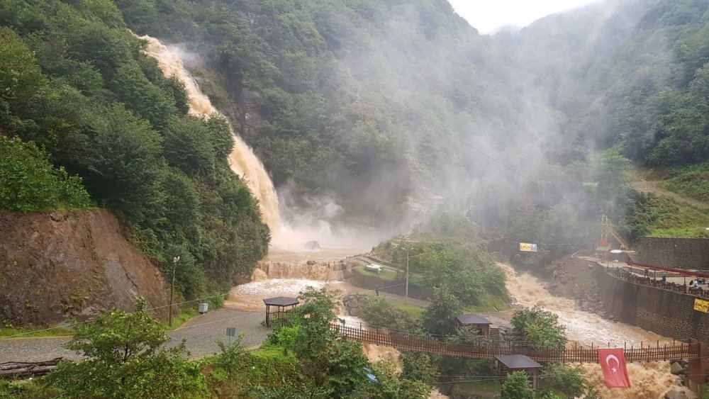 Rize’nin Çayeli ilçesinde bulunan Ağaran Şelalesi, bölgede kısa süreli yağan şiddetli yağmurun ardından taştı.