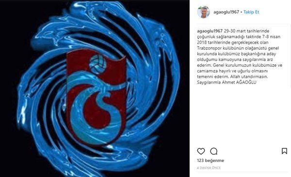 Ahmet Ağaoğlu, iHA muhabirine yaptığı açıklamada şu ifadelerini kullandı "29-30 Mart tarihlerinde çoğunluk sağlanamadığı taktirde 7-8 Nisan 2018 tarihlerinde gerçekleşecek olan Trabzonspor kulübünün olağanüstü genel kurulunda başkanlığa aday olduğunu belirterek, " Uzun süredir bir çalışmanın içerisindeydim. Bugüne kadar beklememin nedeni mevcut yönetim kurulunda yer alan arkadaşlarımızın kararlarını yeniden gözden geçirirler diye düşündüm. Bu konuda zaman dolunca bende adaylığımı açıklama gereği duydum. Genel kurulumuzun, kulübümüze ve camiamıza hayırlı ve uğurlu olmasını temenni ederim. Zor bir görev üstlendiğimizin bilincindeyiz. İnşallah hep birlikte , camia olarak bu zor günleri atlatacağız. Allah utandırmasın "ifadelerini kulandı.