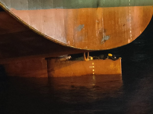Rutin bir incelemede Salvamento Maritimo, devriye botu 901 fitlik konteyner gemisinin dümeninin üzerinde, ayaklar üzerinde, suyun üzerinde yatan iki kişiyi gördüğünü bildirdi.