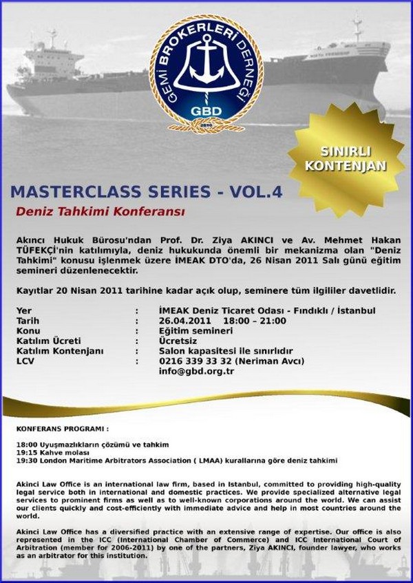 Akıncı Hukuk Bürosu'ndan Prof. Dr. Ziya AKINCI ve Av. Mehmet Hakan TÜFEKÇİ'nin katılımıyla, deniz hukukunda önemli bir mekanizma olan "Deniz Tahkimi" konusu işlenmek üzere İMEAK DTO'da, 26 Nisan 2011 Salı günü eğitim semineri düzenlenecektir.