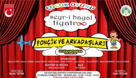 Akyazı Belediye Başkanı Hasan Akcan’ın talimatı ile harekete geçen Akyazı Belediyesi Kültür ve Sosyal İşler Müdürlüğü, “Seyri Hayal Tiyatro” grubunu 23 Nisan Ulusal Egemenlik ve Çocuk bayramında çocuklara tiyatro gösterisi düzenleyeceğini bildirdi. Yaklaşık 1 aydır provalarını sürdüren Milli Türk Talebe Birliği tiyatro ekibi Seyri Hayal Tiyatro grubu tüm hazırlıklarını tamamlayarak, 23 Nisan Ulusal Egemenlik ve Çocuk bayramında çocuklara bir oyun hazırladı. Yönetmenliğini Burak Tutar, Yardımcı yönetmenliğini Furkan Özel’in yaptığı ‘Ponçik ve Arkadaşları’ adlı tiyatro oyununu Cabir Özcan yazdı.