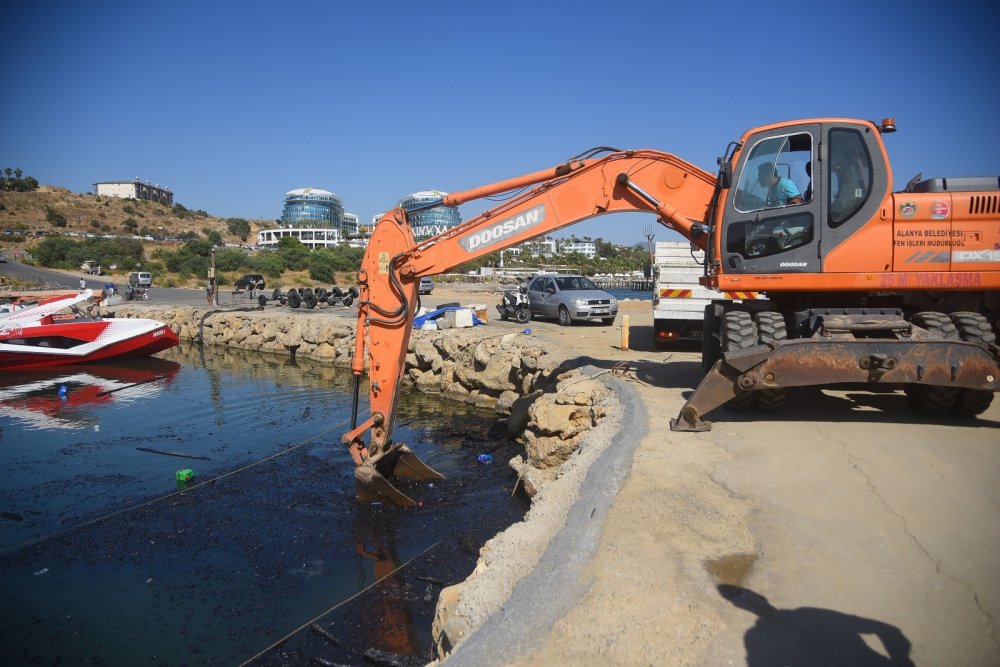 Alanya Belediyesi Çevre Koruma ve Kontrol Müdürlüğü ile Temizlik İşleri Müdürlüğü ekiplerinin ortak çalışması sonucu deniz yüzeyinde ve kıyıda oluşan yangın atıkları toplanmaya devam ediyor. Belediye ekipleri yanan teknelerden kaynaklı deniz kirliliğine deniz yüzey araçları ile hem karadan hem de su yüzeyinden müdahale ederek temizlik yaptı. Atıkların tamamen bertaraf edilmesi için batık teknelerin kaldırılmasının ardından 2. etap detay temizliği yapılacağı açıklandı.