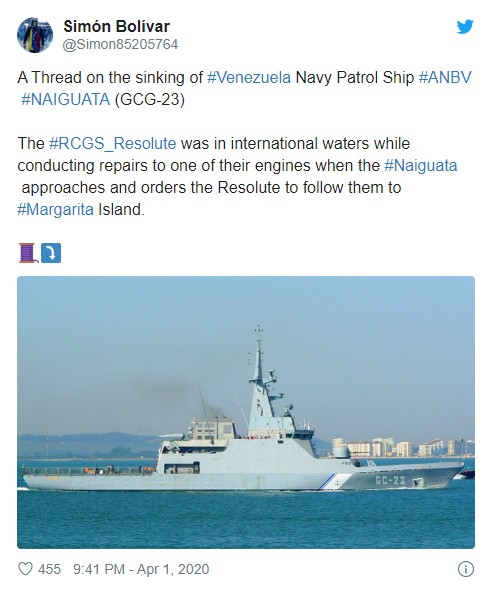32 mürettebatı bulunan Alman RCGS Resolute adlı cruise gemisinden yapılan açıklamada, Venezuela donanmasının 135 derece açıyla sancak tarafından yanaştığı, kendilerine silahla ateş edildiği ve defalarca çarptıktan sonra da su alarak battığı ileri sürüldü.