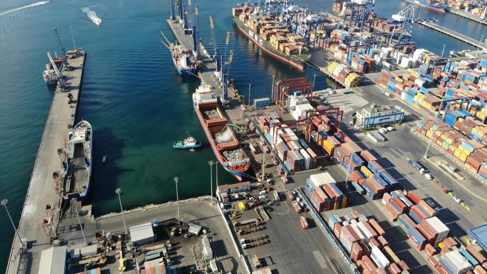 Ambarlı Limanı’nda ICDAS5 adlı gemide çıkan yangın havadan görüntülendi.