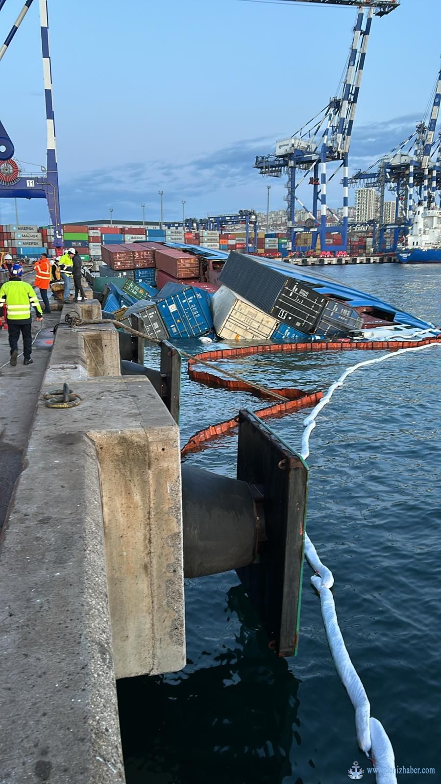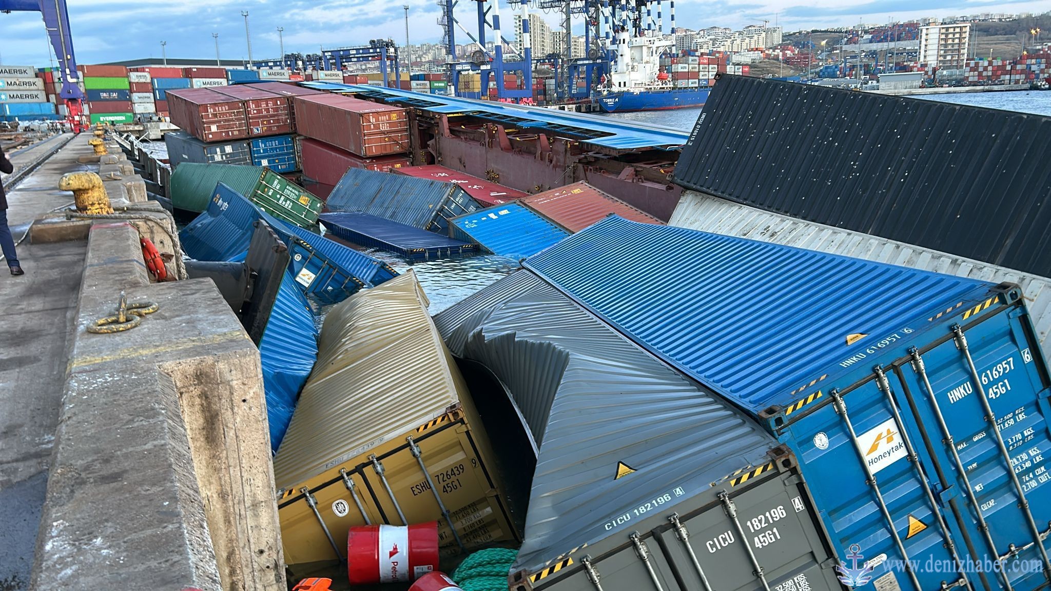 İstanbul Ambarlı Marport Limanı'nda AMNAH isimli konteyner yüklü gemi sabaha karşı yan yattı. Konteynerlerden bazıları denize dökülürken bölgedeki çalışmalar devam ediyor.