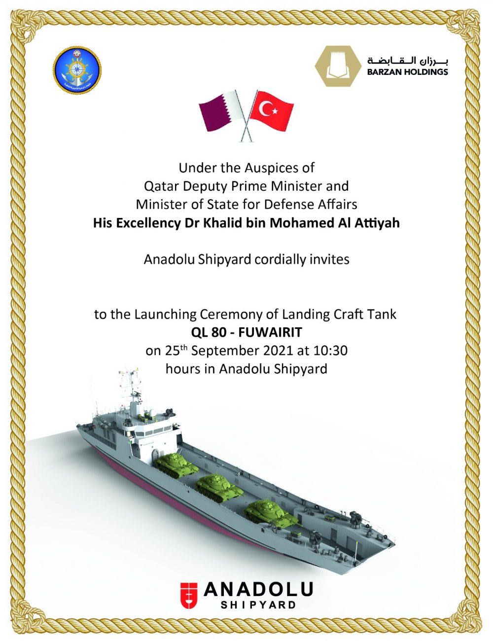 LCT (LANDING CRAFT TANK) çıkarma gemisinin denize indirilme töreni 25 Eylül’de Katar ve Türkiye’den üst düzey askeri ve sivil yetkililerin katılımı ile gerçekleştirilecek.