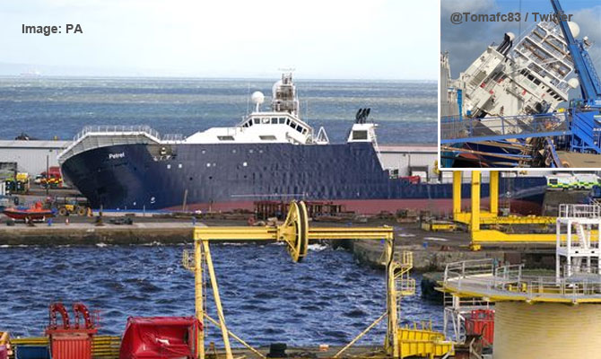 Araştırma gemisi PETREL, 22 Mart sabahı İskoçya'nın Edinburgh kentindeki kuru havuzda şiddetli rüzgar nedeniyle alabora oldu.