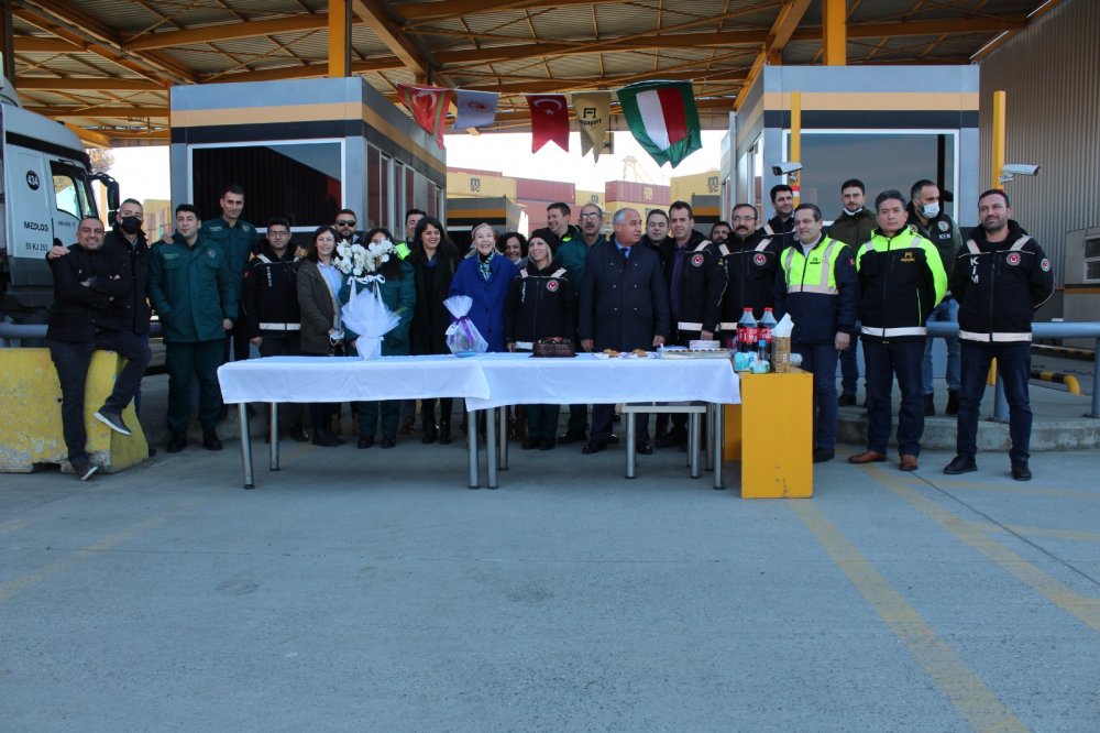 26 Ocak Dünya Gümrük Günü Türkiye’nin en büyük konteynır limanı olma özelliğini taşıyan ve her yıl yeni rekorlara imza atan Asyaport’ta bir dizi etkinlikle kutlandı. Kutlama törenine Gülsün Soyuer, Asyaport Gümrük Muhafaza Kısım Amiri Zeliha Şafak Yılmaz, Tekirdağ Gümrük Muhafaza Kaçak İstihbarat Müdürü Tahir Demir, Asyaport çalışanları, gümrük muhafaza memurları katıldı. Gümrükçülerin gününü kutlayan Soyuer, pasta keserek çiçek takdim etti.