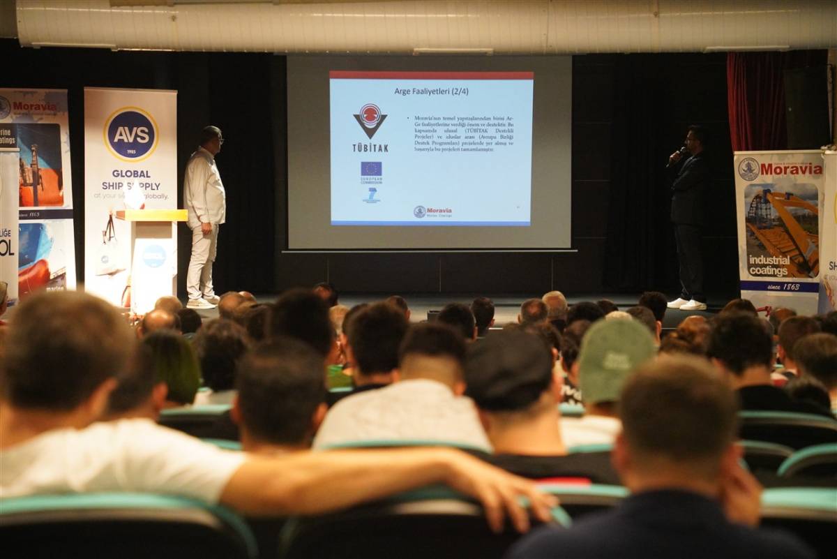 Öğrencilerin yoğun ilgisiyle gerçekleştirilen etkinlikte, Moravia Türkiye Yöneticisi Dr. Sinan Okumuş, Yurtdışı Satış Müdürü Ali Akçalı ve Yurtiçi Satış Müdürü Yılmaz Özkaya tarafından kapsamlı bir sunum gerçekleştirildi. Sunumda Moravia'nın üretim süreci, ürün çeşitliliği, yerli üretimin önemi ve denizcilik sektöründeki uygulama alanlarına dair bilgiler paylaşıldı.