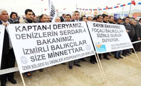 Bakan Yıldırım'a Osmanlı İmparatorluğunda Deniz Kuvvetleri Komutanı anlamına gelen Kaptan-ı Derya unvanını yakıştıran İzmirli balıkçıların pankartı dikkatlerden kaçmadı.