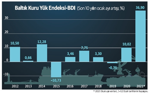 2021’e bin 350 puanla başlayan Baltık Kuru Yük Endeksi, geçen hafta hızlı bir yükseliş trendine girdi. Özellikle geçen perşembe günü yaşanan hareket sonrası endeks geçen haftayı bin 600 puanda kapattı. Böylece 16 Ekim’den bu yana en yüksek seviyeye ulaştı. Yabancı brokerlar bu yükselişi ‘çılgın parti’ olarak tanımladı. BDI’deki artış bu hafta itibariyle hızlandı. Endeks sadece bir günde 160 puana yakın artış göstererek pazartesi bin 761 puana ulaştı. Küresel ekonomiye dair olumlu sinyaller veren bu gelişmenin en çarpıcı yanı ise endeksin, yaklaşık 10 yıldır ilk kez ocak ayında yükselişe geçmiş olması. Bundan önceki yıllarda BDI, aralık ortasından şubat ortasına kadar hep düşüş eğiliminde oldu ya da çok az artış yaşandı. Noel tatilini de kapsayan bu dönem, sektörde ‘ölü sezon’ olarak değerlendiriliyordu.