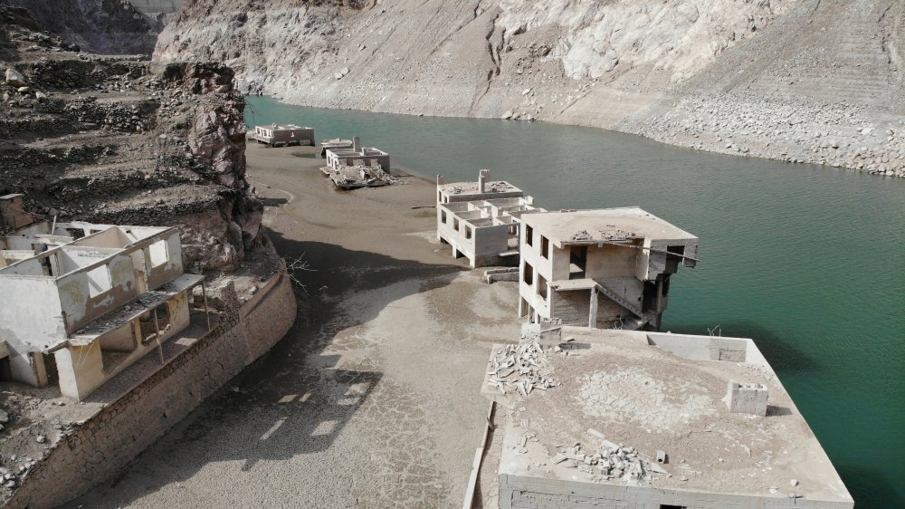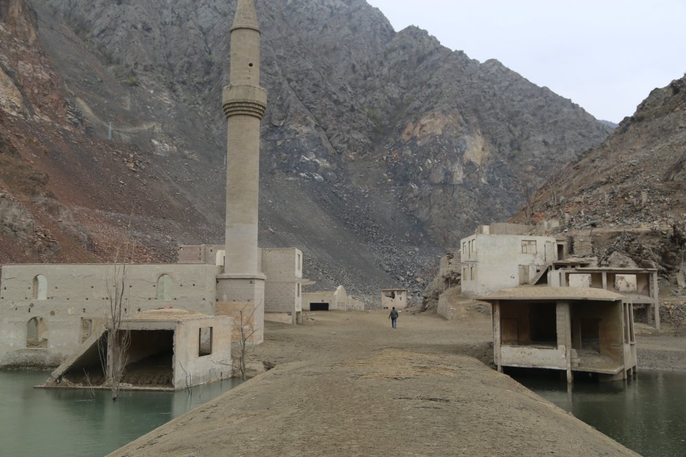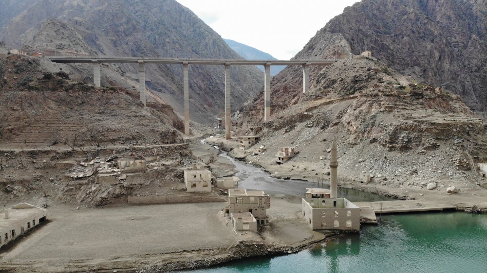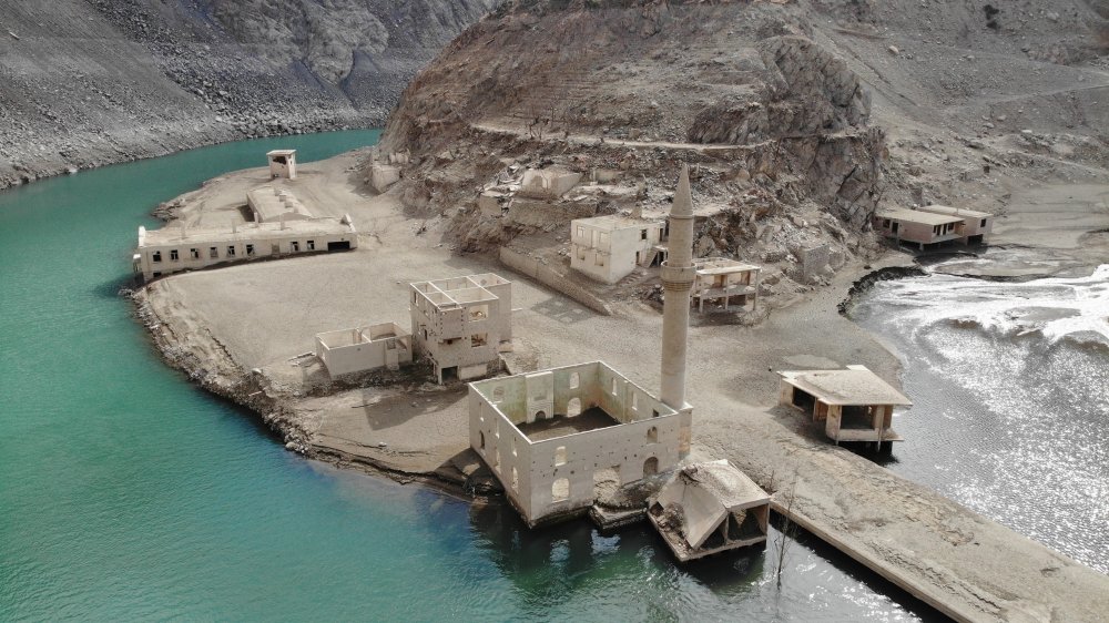 Artvin'de Çoruh Nehri üzerine kurulan Deriner Barajı gölü suları altında kalan Narlık köyü yerleşim alanı, baraj suları çekilince ortaya çıktı. Hayalet köyde bulunan camiler, okullar, evler havadan görüntülendi.