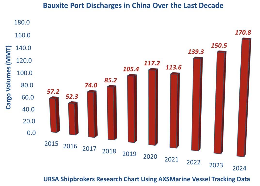 Yunanistan merkezli Ursa Shipbrokers tarafından takip edilen AXSMarine verilerine göre, 2025 yılının ilk yarısında Çin kıyılarındaki limanlara yapılan boksit boşaltmaları 106,7 milyon ton oldu. Bu rakam, 2024’ün ilk yarısına göre 22,5 milyon tonluk bir artış anlamına geliyor. Çin’e gelen boksitin yaklaşık üçte ikisi Capesize ve Newcastlemax tipi gemilerle taşınıyor.