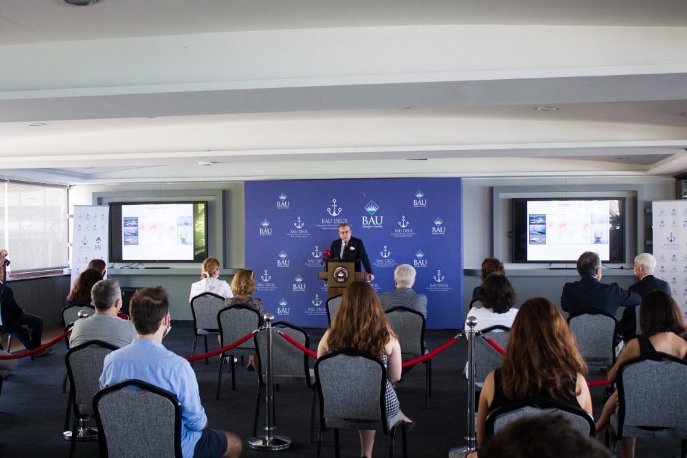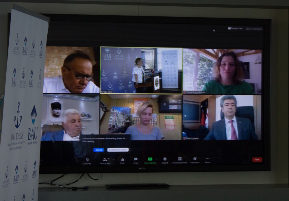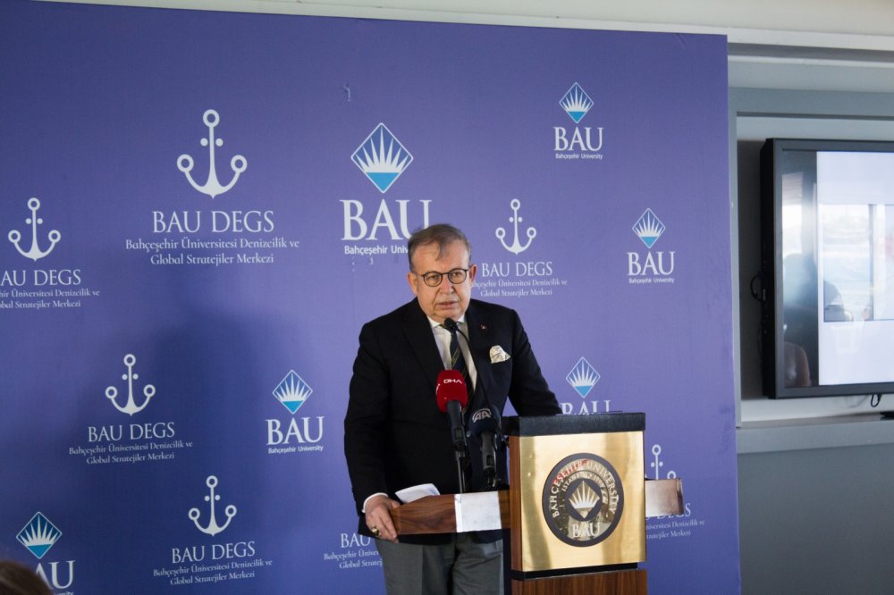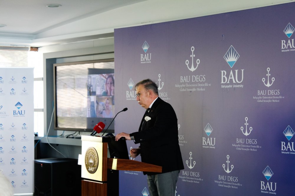 BAU Denizcilik ve Global Stratejiler Merkezi Açılış Lansmanında açılış konuşmalarını BAU Rektörü Prof. Dr. Şirin Karadeniz, Emekli Tümamiral Cahit Yaycı yaptı.
