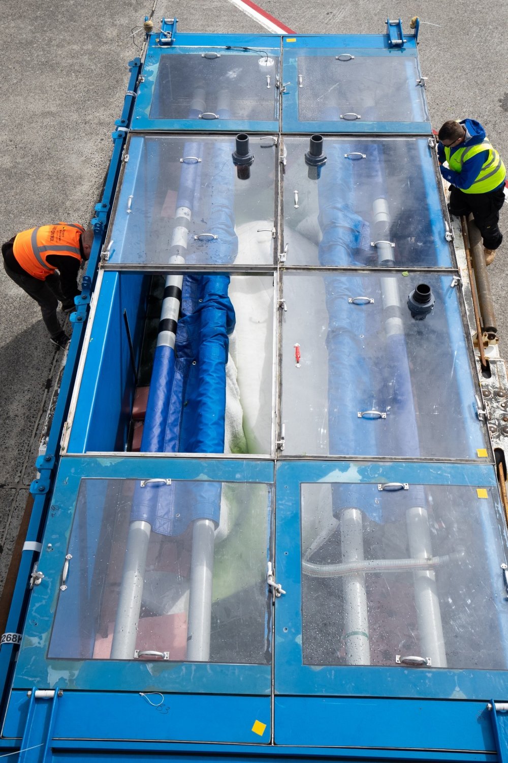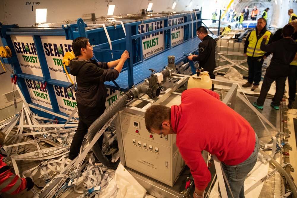İki beluga fiziksel özelliklerine tam olarak uyan özel tasarlanmış kaldırma kayışlarıyla kaldırıldı ve daha sonra özel tasarım konteynerlere yerleştirildiler. Changfeng Ocean World’den Şanghay Pu Dong Havaalanı’na kamyonla yapılan yolculuktan sonra balinalar özel markalı kargo uçağına taşındılar. Prosedür başarıyla gerçekleştirildi ve uçak Şanghay’dan hareket etti.