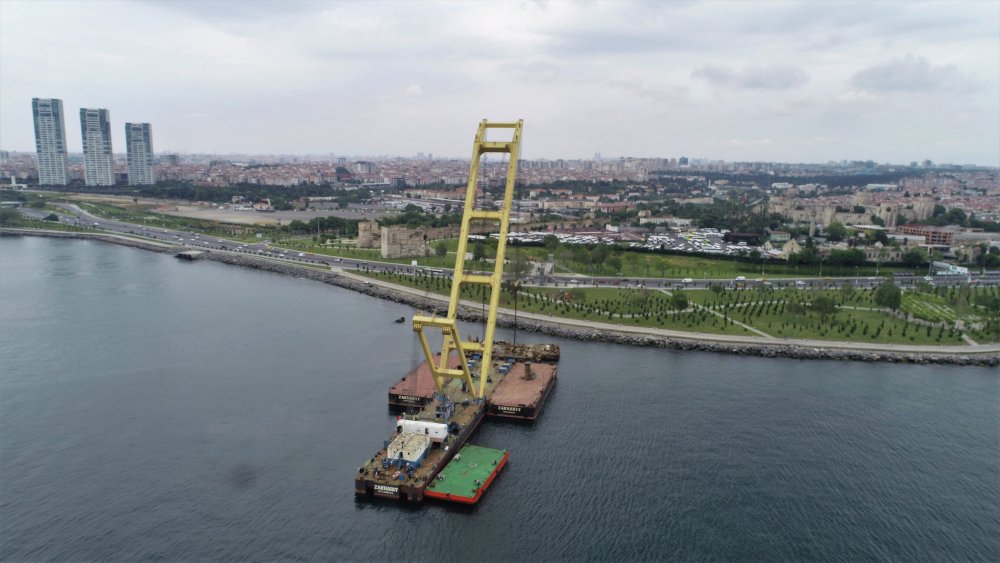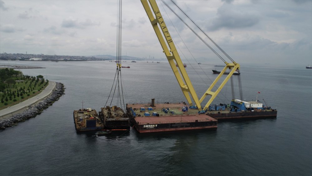 Zeytinburnu sahilinde batık bir şekilde bulunan “Bereket” isimli kuru yük gemisinin sökülme işlemleri için deniz üzerine kurulan dev vinç kullanılıyor. Su altında belirli kısımları kesilen batık gemiyi vinç parçalar halinde kaldırıyor. Küçük kısımları gemilere yüklenip götürülüyor. Geminin su üzerinde gözüken kısmı da yerinden sökülerek sahilin kenarına getirildi. Dev vinçle Zeytinburnu sahilinde söküm işlemleri yapılırken havadan görüntülendi. Çekilen görüntülerde vincin büyüklüğü gözler önüne serildi. Yıllarca suyun içinde çürüyen gemi işçiler tarafından parçalarına ayrılıyor. Tanzanya bandıralı 2 bin 980 grostonluk, 115 metre uzunluğundaki "Bereket" adlı kuru yük gemisi söküm işleri devam ediyor.