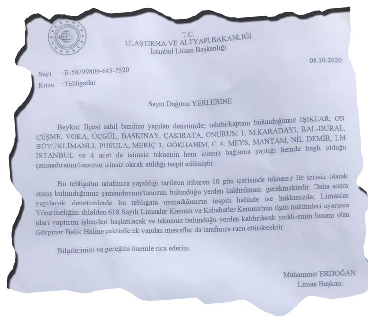 İstanbul Liman Başkanlığı tarafından adı geçen alandaki irili ufaklı 24 adet tekneye gönderilen tebligatta teknelerin izinsiz bağlandığı ve bağlanılan tonozların da izinsiz atıldığı belirtilerek tebligatın tebliğinden itibaren 10 gün içinde teknelerin ve bağlandığı tonozların kaldırılması istendi.