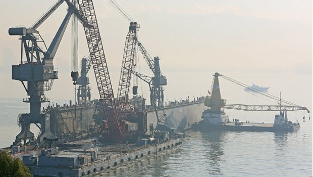 Bakım için getirildiği İzmir Tersanesi'nde bakım havuzu içinde yan yatan TCG Değirmendere Römorkörü'nün kaldırılması için çalışmalara başlandı.