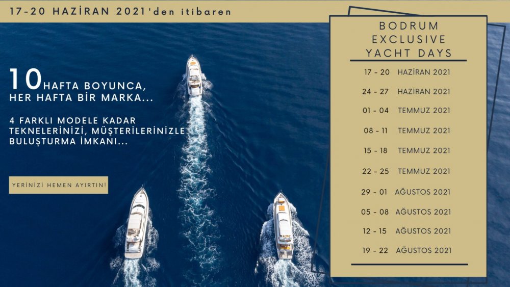 Türkiye’nin deniz üstünde düzenlenecek ilk butik deniz günleri “Bodrum Yacht Fest”in ilki, 17-20 Haziran tarihinden itibaren 10 hafta boyunca her Perşembe-Pazar günleri arasında gerçekleştirilecek “Bodrum Exclusive Yacht Days” ile her hafta farklı bir markaya ev sahipliği yapılacak.