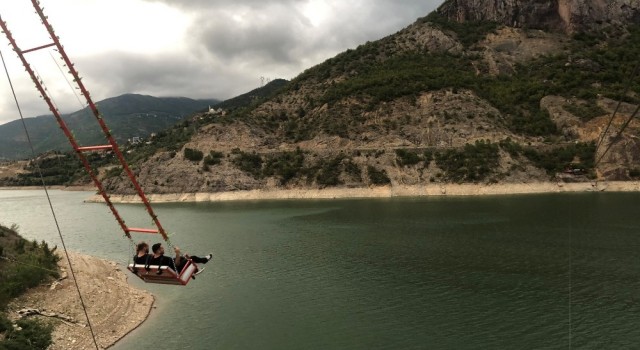 Artvin-Borçka Karayolu üzerindeki Borçka Baraj gölünün kıyısına kurulan dev salıncak adrenalin tutkunlarının gözdesi oldu.
