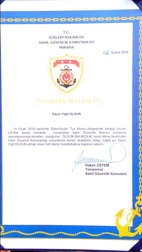 Balıkçı Yiğit Olgun, 15 Ocak 2016 günü Yunan botunun Türk karasuları içinde karaya oturması olayında verdiği destekten dolayı kendisine Sahil Güvenlik Komutanlığı tarafından teşekkür belgesi hazırlandığını, belgenin Sahil Güvenlik Marmaris Grup Komutanı Albay Mete Çağlar tarafından kendisine takdim edildiğini belirtti. Sahil Güvenlik Komutanı Tümamiral Hakan Üstem’in imzasıyla gönderilen taktir belgesinde, "15 Ocak 2016 tarihinde Didim Tuzburnu bölgesinde karaya oturan ’LS-604’ borda numaralı Yunanistan Sahil Güvenlik botunu kurtarma operasyonunda donatanı olduğunuz ’Olgun Balıkçılık’ isimli tekne tarafından Sahil Güvenlik Komutanlığı unsurlarına verilen destekten dolayı başta siz Yiğit Olgun olmak üzere tüm tekne mürettebatına teşekkür ederim" ifadelerine yer verildi.