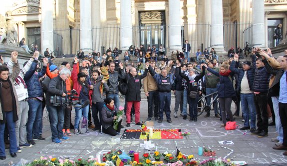 Yüzlerce Belçikalı vatandaş ise dayanışma mesajı vermek için Brüksel’in en işlek caddelerinden Bourse meydanında buluştu. Tebeşir ve kalemler ile yerlere, ‘hepimiz insanız ve hepimiz aynıyız’ mesajları yazıldı. Terörün rengi, dini ve ırkı olmadığını gösteren Belçikalı vatandaşlar el ele pozlar verdi. Dayanışmaya farklı etnik kökenlerden vatandaşlar katıldı.