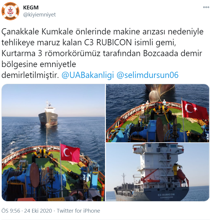 C3 RUBICON isimli gemi, Çanakkale Kumkale önlerinde makine arızası nedeniyle tehlikeye maruz kaldı. C3 RUBICON isimli gemi, Kıyı Emniyeti Genel Müdürlüğüne ait Kurtarma 3 römorkörü ile Bozcaada demir bölgesine emniyetle