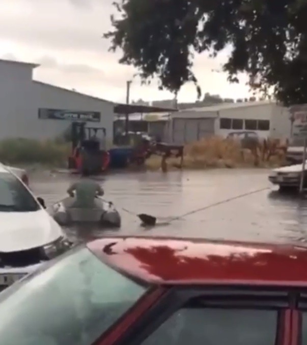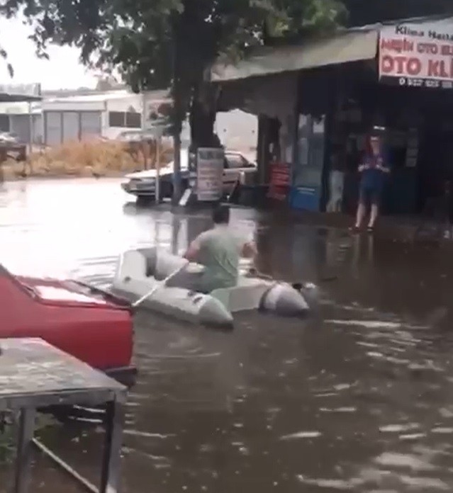 Çanakkale'de bu sabah saatlerinde aniden bastıran sağanak yağış sonrası ilginç görüntüler ortaya çıktı. Bir vatandaşın dışarıya deniz botuyla çıkarak kürek çektiği görüldü.