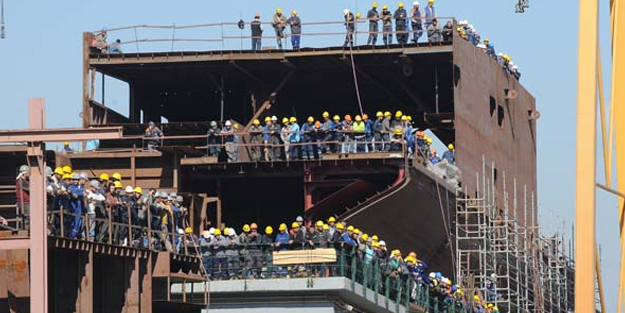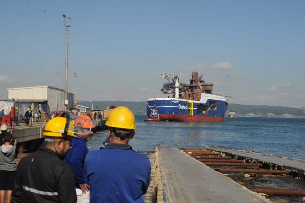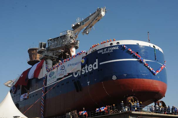 Cemre Tersanesi'nde Fransız firması için inşa edilen rüzgar türbini destek gemisi düzenlenen törenle denize indirildi.