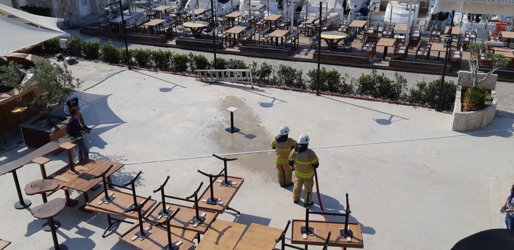 Özellikle yaz aylarında restoran ve kafelerin yoğun olarak kullanılması nedeniyle işletmelerden birinde senaryo gereği çıkan yangına ç müdahale edildi. İşletmenin bahçesine giden yollara güvenlik şeritlerinin çekilmesi ve alanın elektriklerinin kesilmesi ile birlikte marina acil durum ekibi portatif yangın söndürücüler ve yangın hortumlarıyla ilk müdahaleyi yaptı.