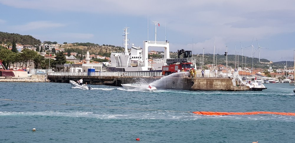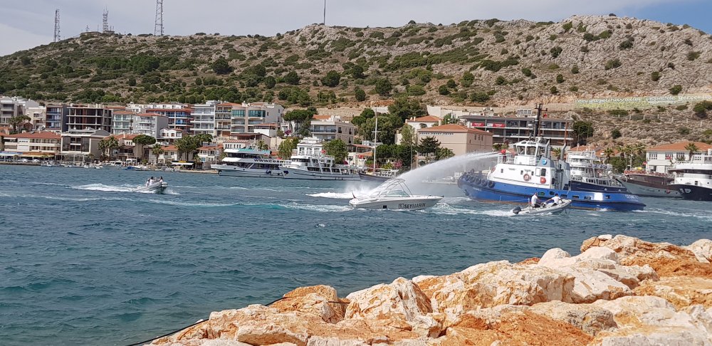Çeşme Marina’da 25 Mayıs günü gerçekleştirilen yangın tatbikatında, senaryo gereği bir teknede yangın çıktı.
