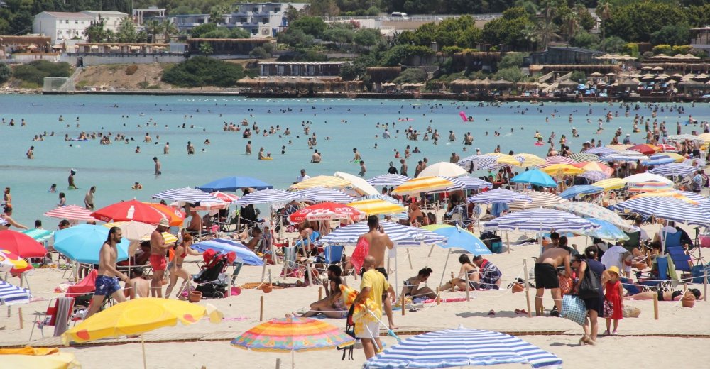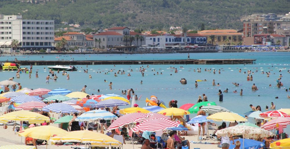 Kurban Bayramı sebebiyle ilan edilen 9 günlük tatili değerlendirmek isteyen vatandaşlar tatil beldelerine akın etti. Tatilini ilk günlerinden itibaren başlayan hareketlilik, Kurban Bayramı'nın ilk gününde de artarak devam etti. Türkiye'nin en ünlü tatil beldelerinden Çeşme'de de tatil yoğunluğu yaşanıyor. Birçok otelde doluluk oranlarının yüzde yüze ulaştığı ilçede dünyaca ünlü Ilıca Plajı da vatandaşların yoğunluk oluşturduğu plajların başında geliyor. Hissedilen sıcaklığın 40 dereceyi bulduğu Çeşme'de vatandaşlar serinlemek için denize girerken, bazı vatandaşlar da plajda güneşlenmeyi tercih etti. Yerleşik nüfusun 40 bin olduğu ilçede, yaşanan bayram yoğunluğu nedeniyle nüfus 1 milyonu buldu. Plajlarda yaşanan yoğunluk havadan görüntülendi.