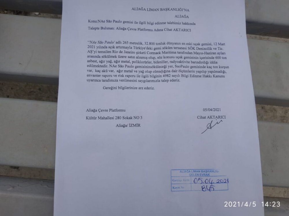 Aliağa Çevre Platformundan Cihat Aktarıcı, Aliağa Eğitim-Sen, Emekli-Sen ve bir grup Aliağa’lı çevreci bugün Aliağa Liman Başkanlığı'na giderek dilekçe verdiler. Geminin içeriğinde bulunan maddelerle ilgili bilgi talebinde bulunulan dilekçeyi Liman Başkanlığı aldı. Ulaşılan bilgiye göre Liman Başkanlığındaki yetkililer gemide bulunan zararlı maddelere ilişkin herhangi bir bilgileri olmadığı ifadesinde bulundu.
